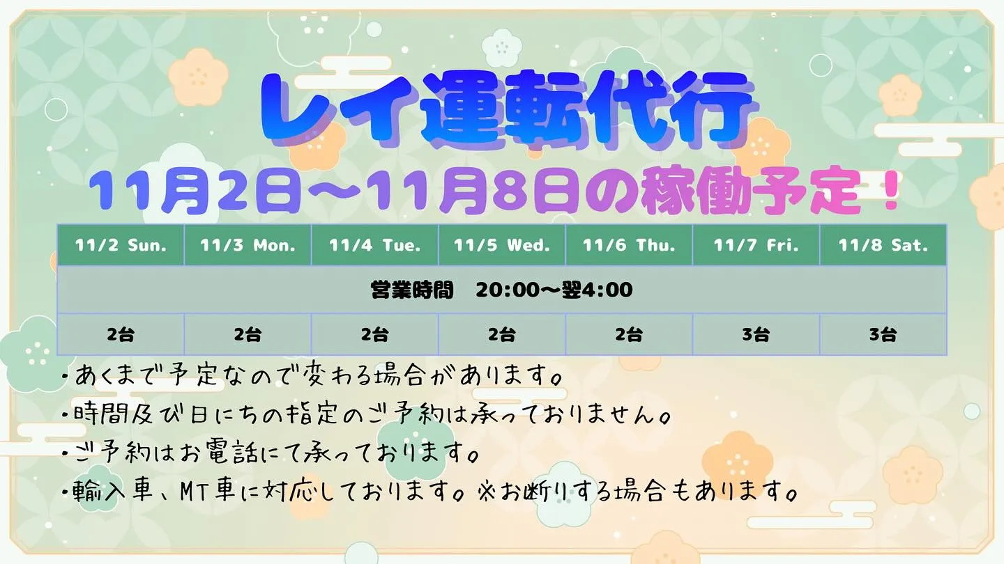 📢 稼働予定のお知らせ 📢稼働予定のお知らせレイ運転代行、11/9(日)〜11/15(土)の稼働予定です✨ご予約の際の目安にしていただければ幸いです!「今日も一杯飲んじゃった!」そんな時は無理せずレイ運転代行へ🍶🚗今週も皆さまの“…